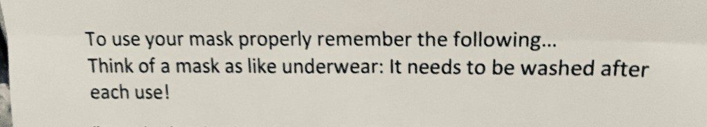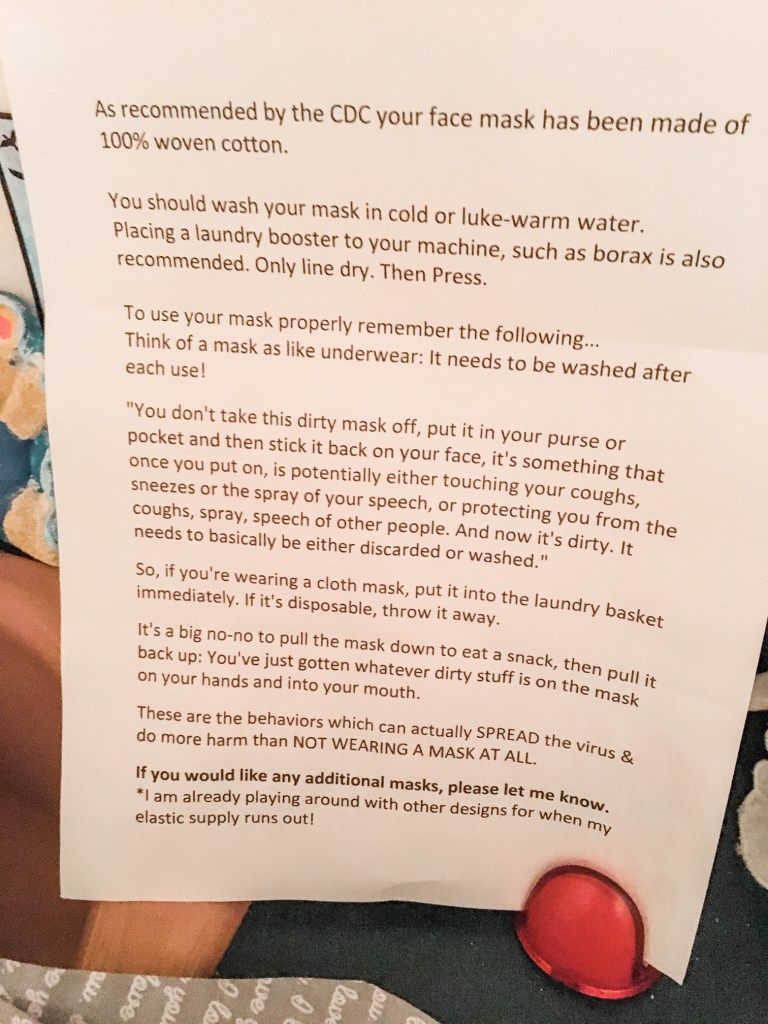 Redheaded female makes delivery of last remaining face mask to One Extraordinary Individual. As in all previous deliveries, approaches the home, lays package at door, rings bell, backs 6 ft away and waits for recipient. Upon opening door Extraordinary Individual finds package, sees redhead and is very excited, very thankful & sweetly surprised to be receiving the hand-made face mask. Takes a moment to read the hand-out. Appears to re-read the hand-out a second time. Then a third. Pauses for a thoughtful moment, then asks the question…